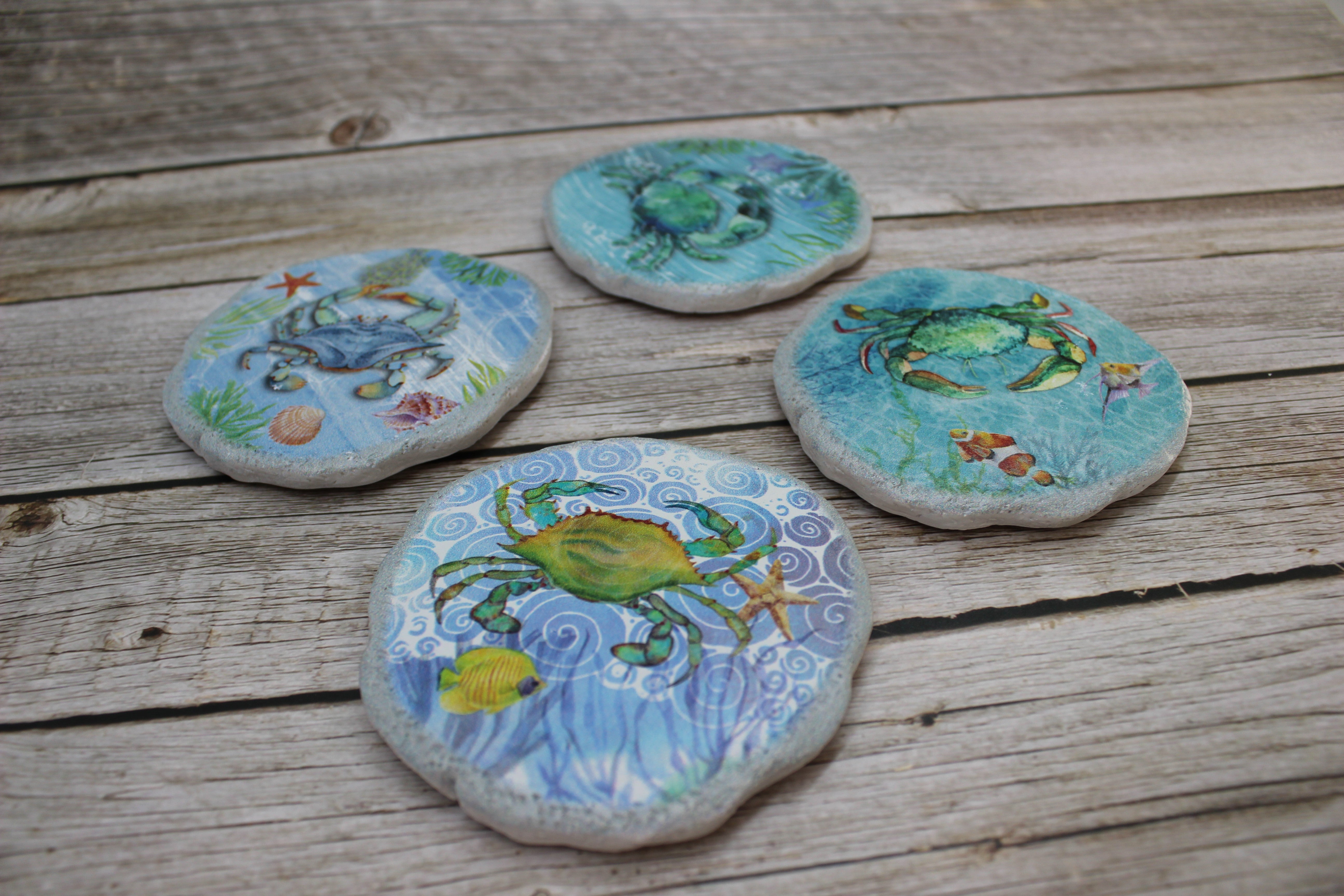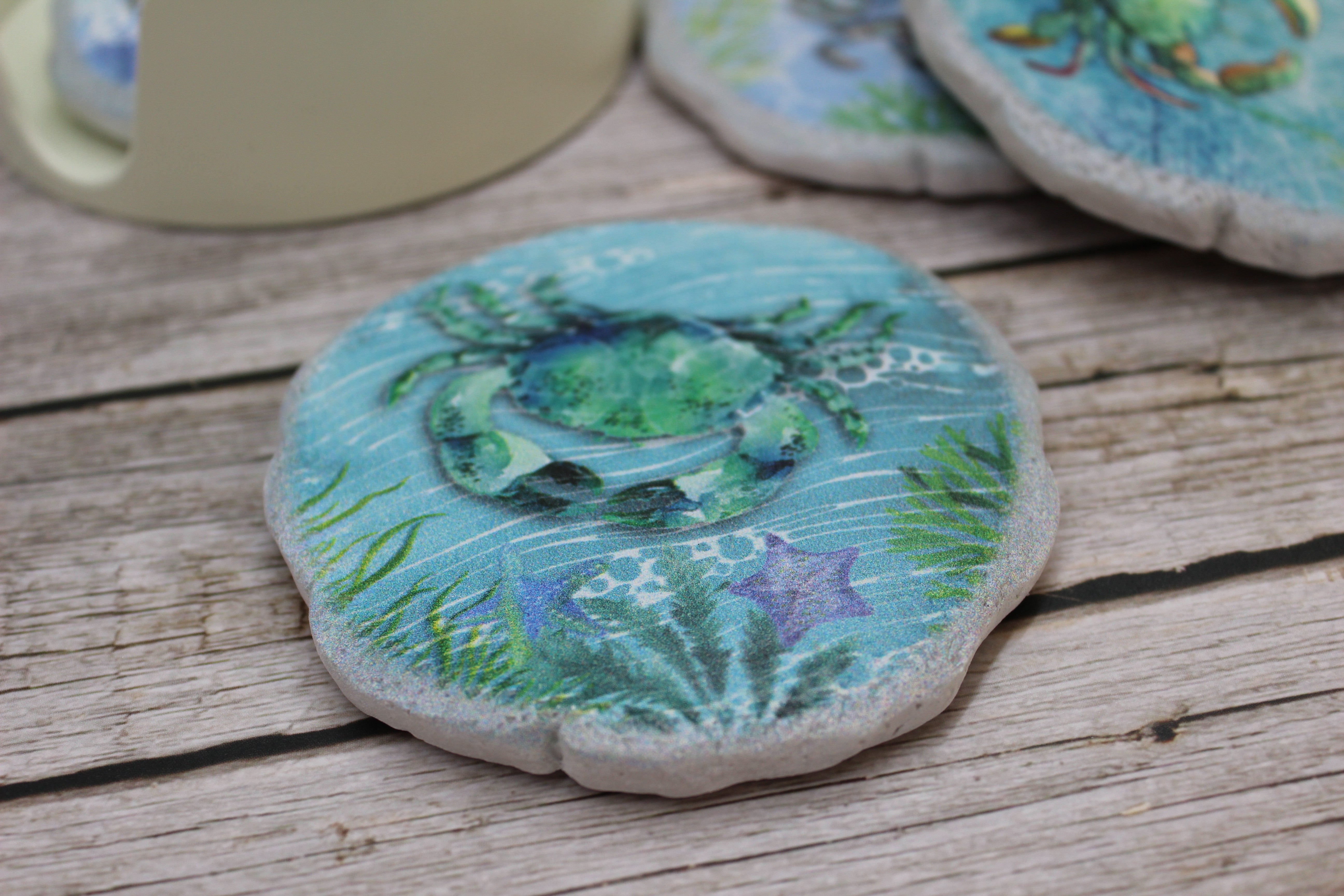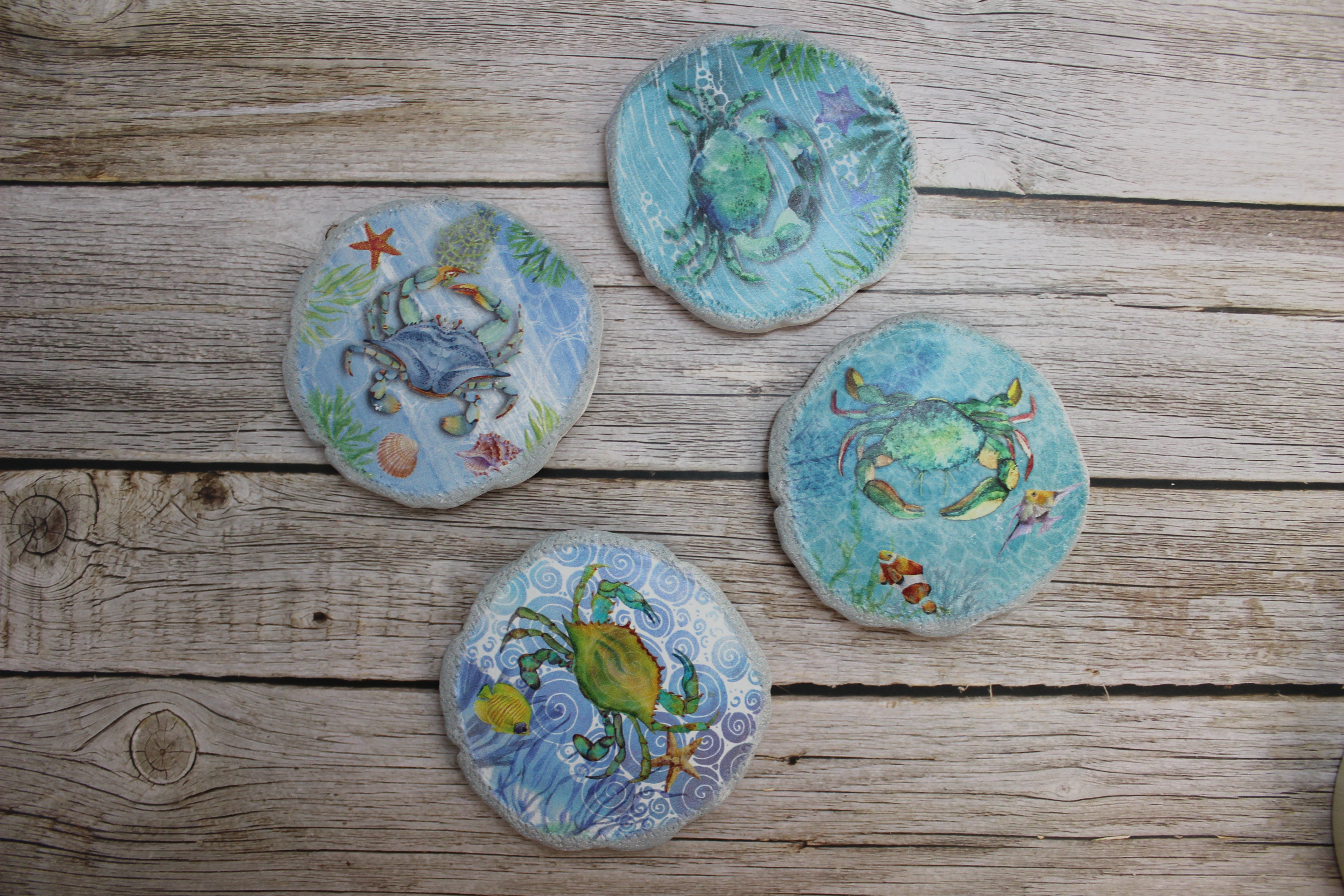 Beautiful crab coasters! This beautiful set of four round crab coasters are ceramic and each one in this set has a different design. Hues of light green and blue decorate these beachy coasters. Just swim away freely with these magnificent crabs as your sip your tea, coffee, water, or juice.