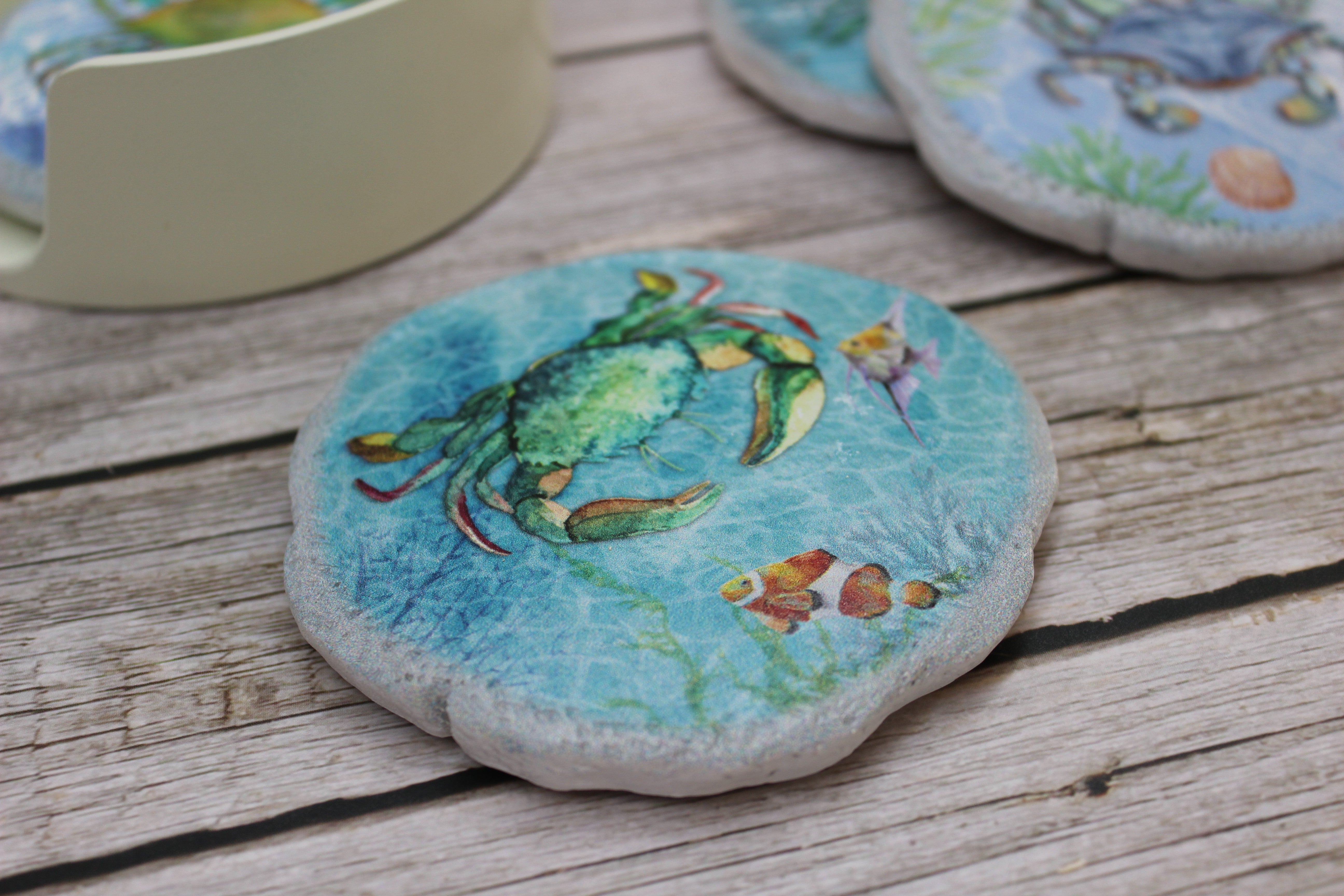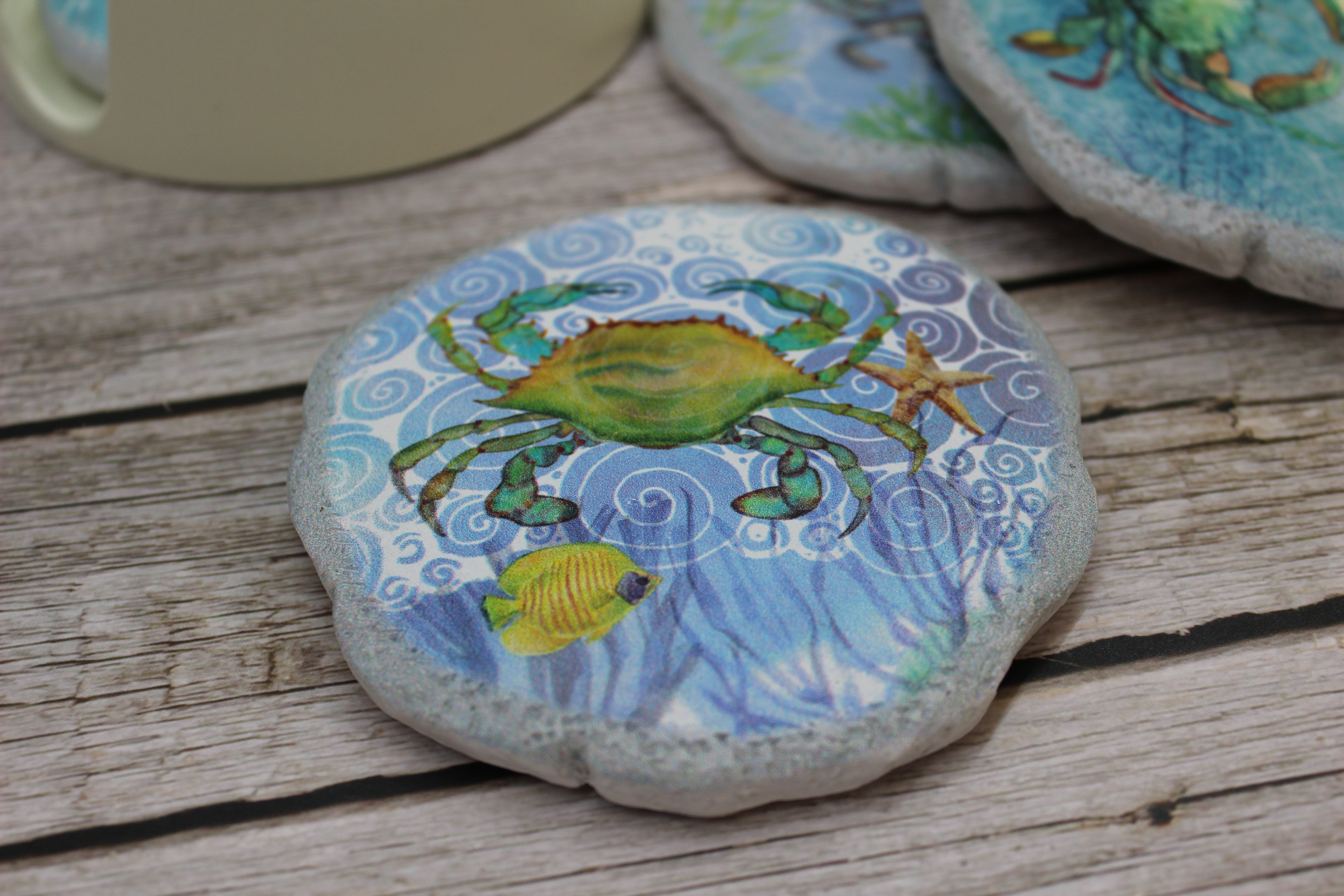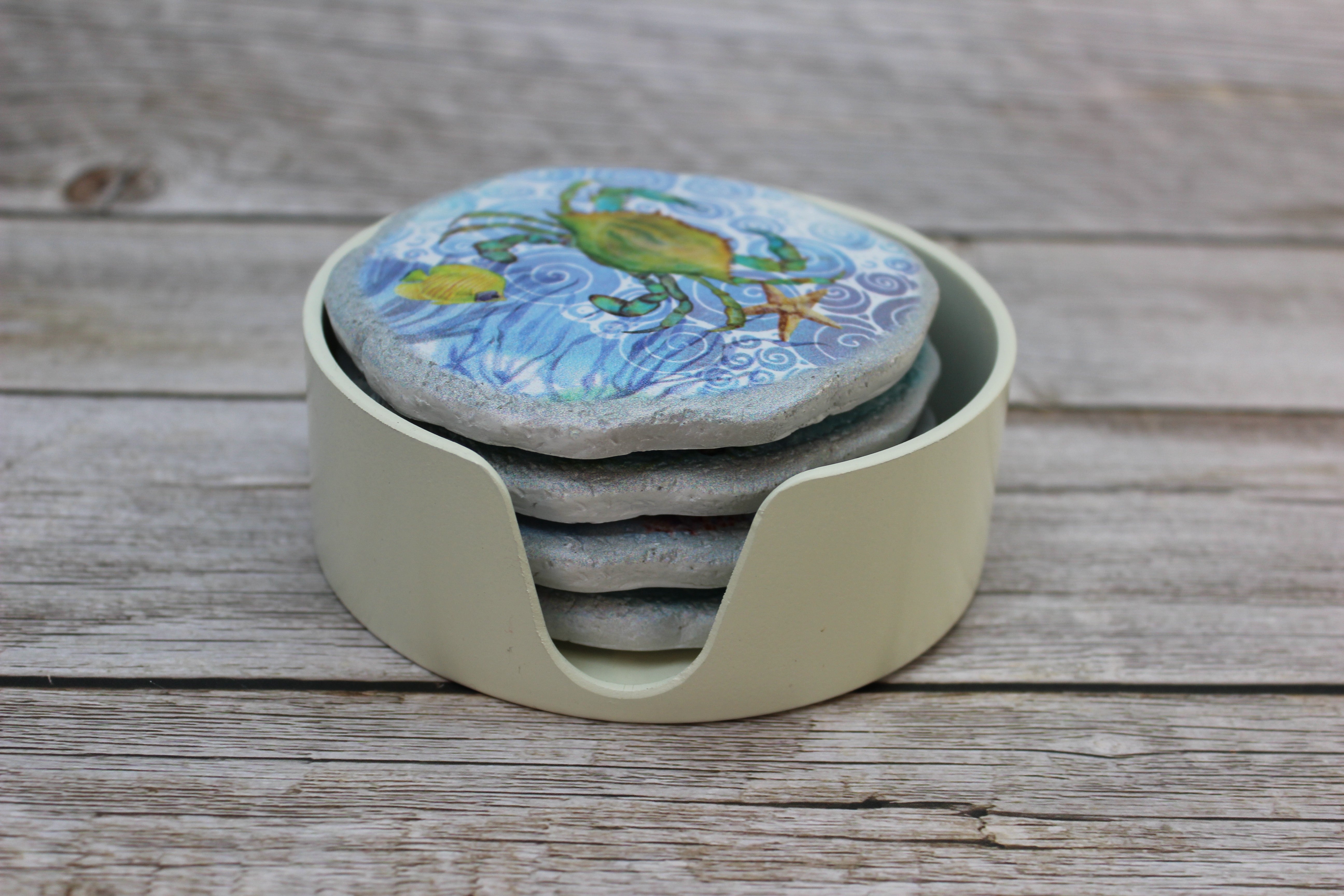 Beautiful crab coasters! This beautiful set of four round crab coasters are ceramic and each one in this set has a different design. Hues of light green and blue decorate these beachy coasters. Just swim away freely with these magnificent crabs as your sip your tea, coffee, water, or juice.
